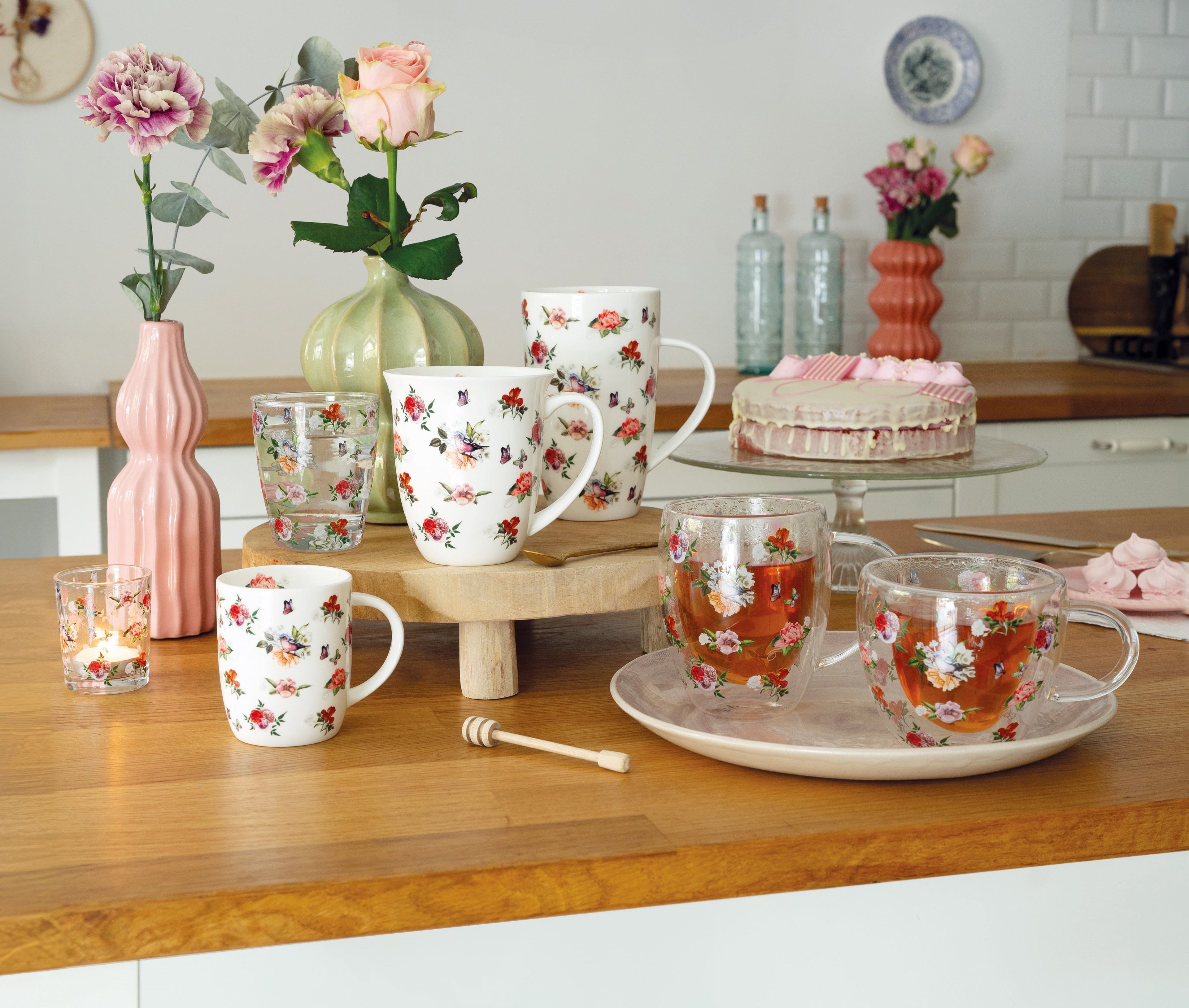 Tazas de porcelana inglesa con ilustraciones de flores y animales estilo cottage...