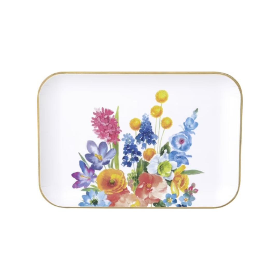 Bandeja de madera pequeña decorada con flores de vibrantes colores, ideal para llevarse un vaso de agua a la cama, para servir un té o café con pastas o como original vacíabolsillos. También es perfecta como elemento decorativo.