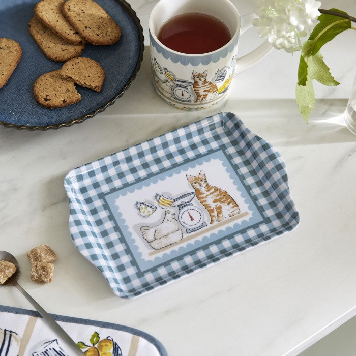 Bandeja de melamina de la firma británica Ulster Weavers con un gatito en la cocina, una escena súpercottage. Esta bandeja de melamina es ideal para llevarte el té o el café al salón, también la puedes usar como elemento decorativo o como original vacíabolsillos.
