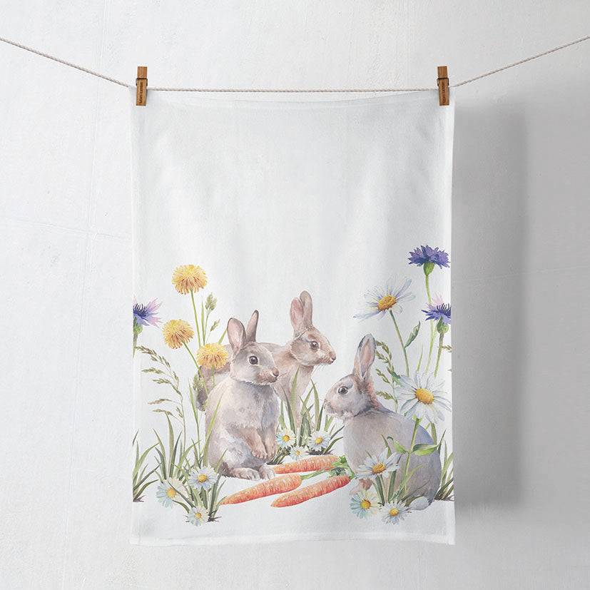 Este paño de cocina (tea towell) decorado con conejitos reunidos en el bosque es 100% algodón. Nos encanta para darle un toque cotagge a tu cocina o para servir un tentenpié.
