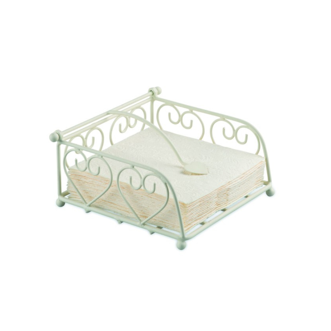 Este servilletero de metal en tono crema con motivos de corazones te permitirá colocar tus servilletas tamaño cocktail decoradas de forma horizontal, de esta manera se podrá apreciar el diseño en su totalidad! Nos encanta su aire cottage.