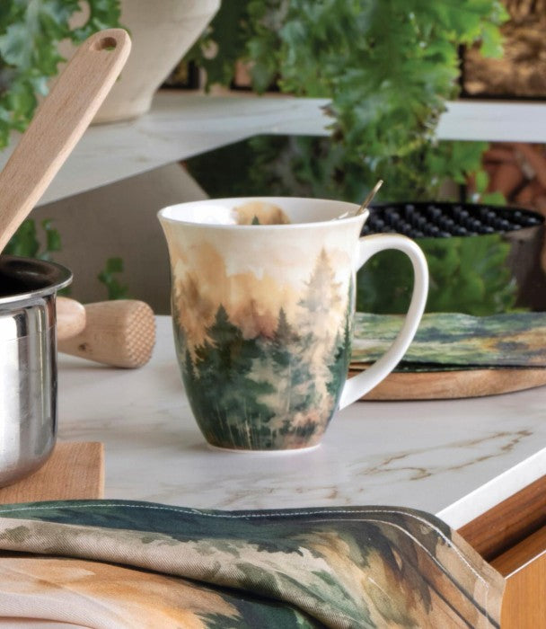 Taza de porcelana decorada con un majestuoso bosque de coníferas en tonos verdes y marrones fabricada en material " fine bone china" (porcelana de alta calidad). Podrás servirte el café o tu bebida caliente preferida disfrutando de su diseño estilo cottage.