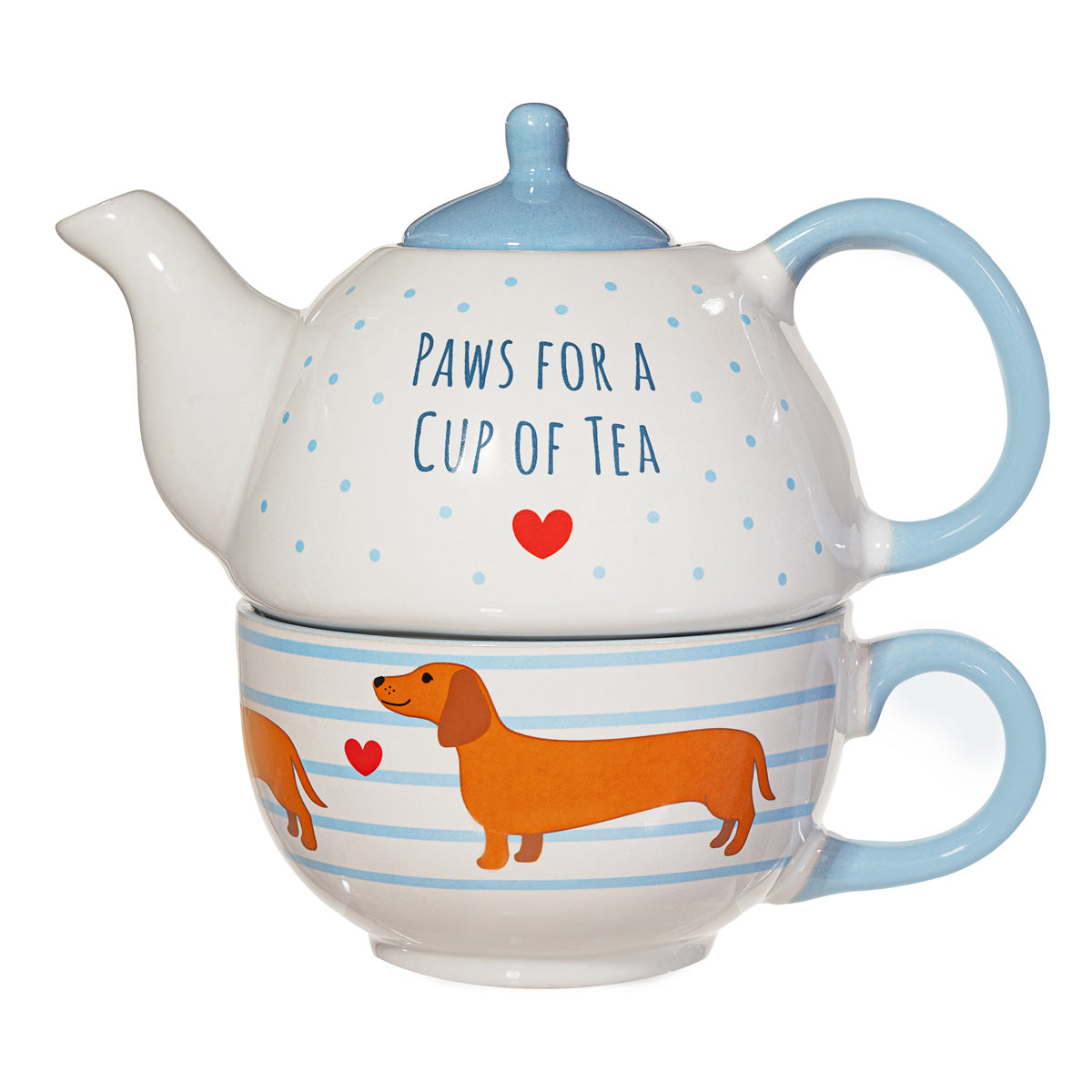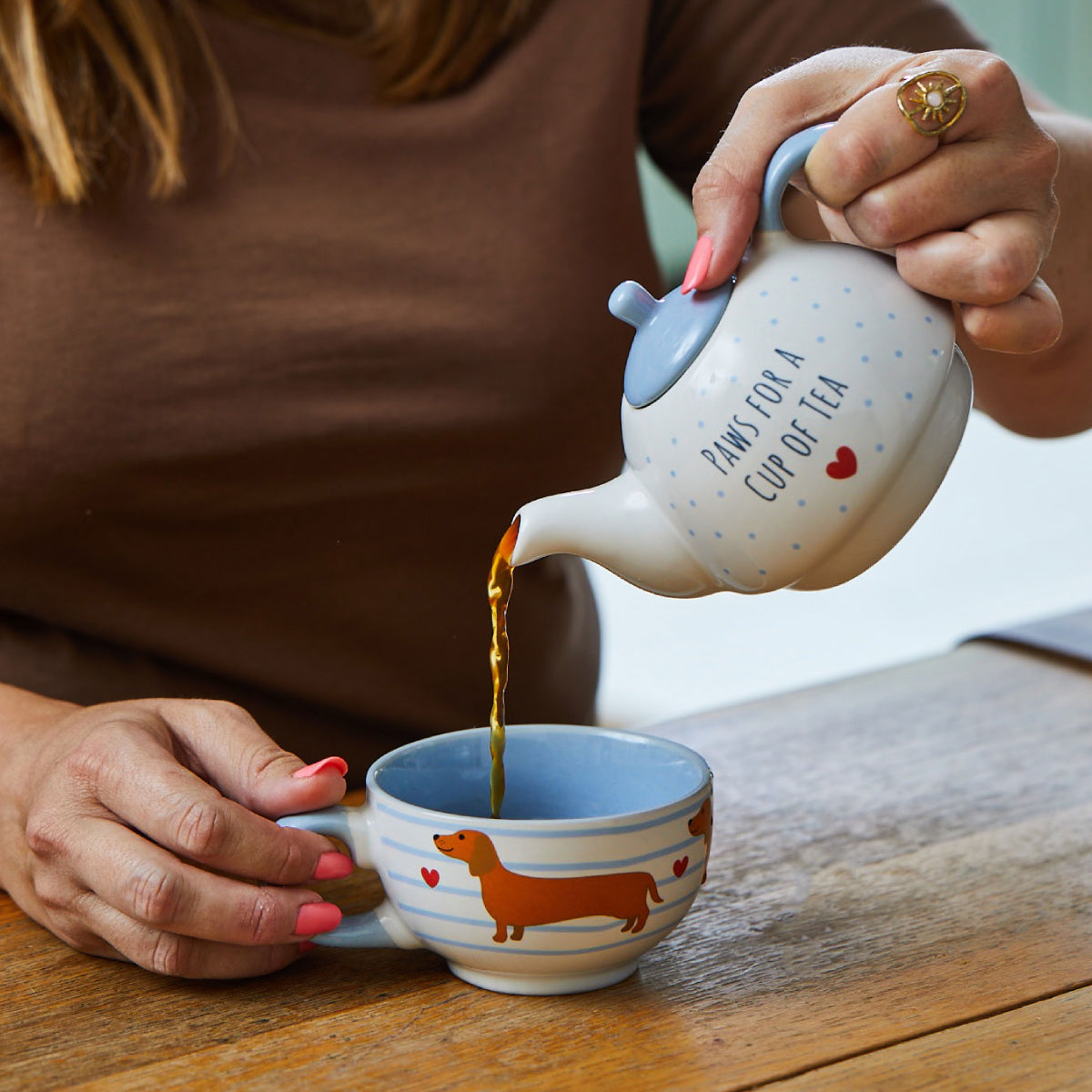 Tetera individual con taza, práctica, para servirte tus tés e infusiones con un divertido diseño de perro salchicha. Una delicia para tu hora del té.