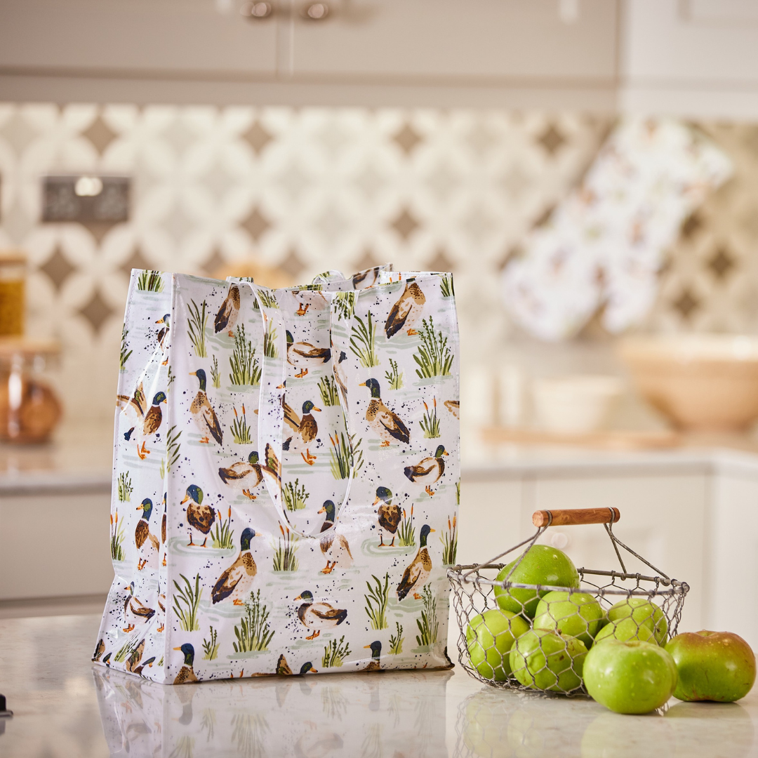 Esta bolsa tipo Harrods con patos salvajes de la marca británica Ulster Weavers se caracteriza por su gran versatilidad, a los estudiantes les encanta para llevar sus carpetas y también es perfecta como bolso personal o como bolsa para la compra. Está elaborada con algodón y forrada con PVC reciclado. Tiene forro interior y un pequeño compartimento con cremallera.